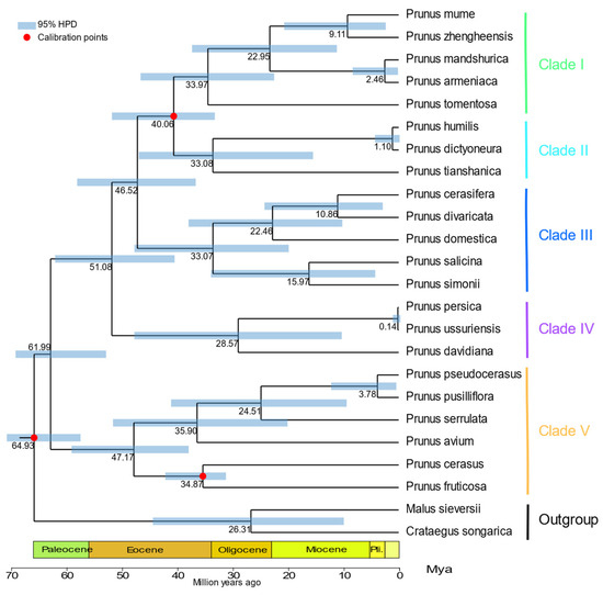 The findings suggest that the estimated emergence of the crown group of Prunus occurred around 64.93 million years ago (Mya), with a 95% highest posterior density (HPD) interval ranging from 56.98 to 69.45 Mya. In Clade I, the estimated crown group age for the subgenus Armeniaca was 22.95 million years ago (95%HPD 11.33–36.48 million years ago), whereas the estimated crown group age for the subgenus Cerasus was 33.08 million years ago (95%HPD 15.59–45.95 million years ago). In Clade III, the time estimation for P. domestica, derived from P. cerasifera and P. divaricata, was 22.46 Mya (95% HPD: 10.36–37.09 Mya). The branch time estimation for Clade IV of subg. Amygdalus was 28.57 Mya (95% HPD: 9.59–40.21 Mya), and the crown cluster time estimation for Clade V of subg. Cerasus was 47.17 Mya (95% HPD: 37.13–57.93 Mya) (Figure 8).