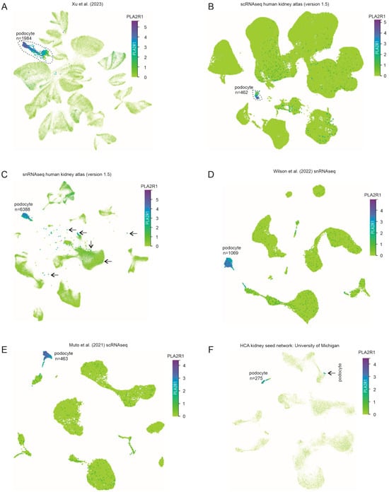 Dominant PLA2R1 expression in podocytes. PLA2R1 mRNA expression in single-cell populations of human kidneys within the following datasets: (A) Xu et al. (2023) [], (B) scRNAseq human kidney atlas (version 1.5), (C) snRNAseq human kidney atlas (version 1.5), (D) Wilson et al. (2022) snRNA [], (E) Muto et al. (2021) scRNAseq [], and (F) HCA kidney seed network: University of Michigan. The podocyte clusters are indicated. For the identities of other kidney cell clusters, please see Supplementary Figures S1–S4. (A,C,F) Podocytes are gated to show PLA2R1 expression. Arrows indicate podocytes (C).