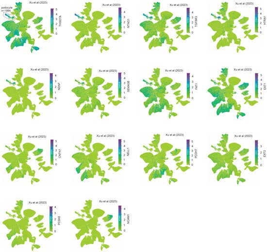 The single-cell RNA sequencing (scRNAseq) data platform CZ CELLxGENE Discover (https://cellxgene.cziscience.com/, accessed on 25 December 2024) [] was used. Under the “Collections” function (https://cellxgene.cziscience.com/collections, accessed on 25 December 2024), we screened scRNA datasets using the criteria of “Normal, Homo sapiens, renal system, kidney, and cortex of kidney” (27 December 2024); a total of 9 studies/collections were selected, including Laket et al. (2023) [], “HCA kidney seed network: University of Michigan” (https://cellxgene.cziscience.com/collections/a98b828a-622a-483a-80e0-15703678befd, accessed on 27 December 2024), Xu et al. (2023) [], McEvoy et al. (2022) [], Wilson et al. (2022) [], Marshall et al. (2022) [], Muto et al. (2021) [], Stewart et al. (2019) [], and Young et al. (2018) []. The McEvoy et al. dataset contained only n = 16 podocytes and was thus excluded from further analysis. We also analyzed the only mouse kidney scRNA dataset, Novella-Rausell et al. (2023) [], which was available in the CZ CELLxGENE Discover platform.
