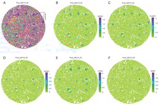 We subsequently examined podocyte expression of PL2AR1, NTNG1, HTRA1, and NDNF at a single-cell level using human kidney slides from the Marshall et al. (2022) dataset [] by taking advantage of the preservation of the location information of gene expression. In the slide Puck_200115_05, we downloaded and reproduced the cell map image with podocyte highlighted (Figure 4A); the podocyte clusters indicate the presence of glomeruli (Figure 4A). As a podocyte marker, NPHS1 expression is within the podocyte clusters, confirming that the mapped cells are podocytes (Figure 4B). PLA2R1, NTNG1, HTRA1, and NDNF are all expressed within individual podocyte clusters (Figure 4C–F). Similar observations were also obtained using a kidney slide from another human kidney, Puck_200104_20 (Supplementary Figure S6), and three other human kidney slides, Puck_200113, Puck_200131, and Puck_200903. Collectively, we provide comprehensive analyses for the podocyte expression of most reported MNTAgs. The podocyte-focused expression of PLA2R1, NTNG1, HTRA1, and NDNF is intriguing, highlighting antigen-initiated autoimmunity as causing podocyte injury and the subsequent MN pathogenesis.