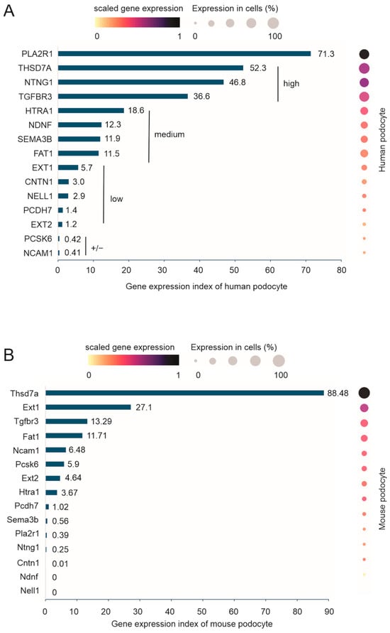 With the demonstration of the podocyte expression of at least 15 MNTAgs (PLA2R1, THSD7A, NTNG1, TGFBR3, HTRA1, NDNF, SEMA3B, FAT1, EXT1, EXT2, CNTN1, NELL1, PCDH7, PCSK6, and NCAM1), it will be interesting to know their level of expression in podocytes, which might be relevant to their ability to cause MN. To address this question, we quantified their expression in podocytes by inputting these antigens as a group into the “Gene Expression” function within CZ CELLxGENE Discover and then retrieved scaled gene expression, which was produced based on the expression of these antigens, and the percentage of podocytes in which individual antigens are expressed. The scaled gene expression allows for a comparison of gene expressions among these antigens. We then calculated the expression indices for individual genes using the formula: scaled gene expression × % of podocytes expressing the target gene × 100. PLA2R1 displays a dominantly high-level expression in podocytes (Figure 5A), which might be an underlying mechanism for PLA2R1 as the dominant MNTAgs [,,]. Other than PLA2R1, THSD7A, NTNG1, and TGFBR3 are expressed at high levels in podocytes (Figure 5A); HTRA1, NDNF, SEMA3B, and FAT1 can be grouped in MNTAgs with medium expression in podocytes (Figure 5A); EXT1, CNTN1, NELL1, PCDH7, and EXT2 are separated into the group of MNTAgs with low levels of podocyte expression (Figure 5A); and PCSK6 and NCAM1 may not be expressed in podocytes (Figure 5A), consistent with reports of both being not expressed in podocytes [].