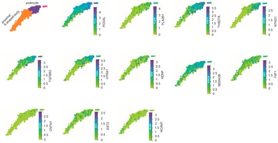 Since the identification of PLA2R1 as the major MNTAg in 2009 [], at least 14 other MNTAgs were lately reported, including THSD7A, NTNG1, TGFBR3, HTRA1, NDNF, SEMA3B, FAT1, EXT1, CNTN1, NELL1, PCDH7, EXT2, PCSK6, and NCAM1 []. Cumulative data reveals a significant role of MNTAgs in directly causing podocyte injury. The relevance of MNTAgs in MN pathogenesis is reflected by the recent call for a two-step MN clarification by the Mayo Clinic consensus group [], which consists of the first-step clarification according to MNTAgs and the second-step determination of the underlying conditions. As knowledge of MNTAgs accumulates, it is crucial to deepen our understanding of their expressions in podocytes in the context of the kidney. This research contributes to this aim by providing a first and comprehensive analysis of MNTAg expression at the single-cell level. Our systemic study of MNTAgs’ expression would enhance antigen-based MN clarification.