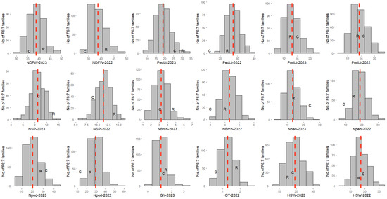 Frequency distributions of the number of days to flower, yield, and related traits in F6:7 RIL population for two years (2022 and 2023). Red lines show the population mean, while letters R and C represent the mean values of the parents, viz., RP270 and CB27, respectively. NDFW = days to first flowering, PedLt = peduncle length, PodLt = pod length, NSP = number of seeds/pod, NBrch = number of branches/plant, Nped = number of peduncles/plant, Npod = number of pods/plant, HSW = hundred-seed weight, GY = grain yield/plant.