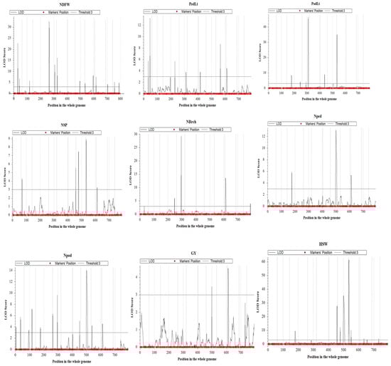 Manhattan plots of QTL mapping results. Each plot shows the LOD scores of markers for the respective traits. Significant QTLs are indicated by peaks that exceed the LOD score threshold, marked by a black dashed line. For the symbols indicating the names of respective traits, refer to Table 3 for explanation.