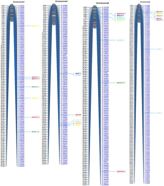 QTL clusters were identified across four chromosomes (Chr1, Chr7, Chr8, and Chr9), where multiple loci associated with yield and other traits are co-located, suggesting genes with pleiotropic effects (Figure 4).
