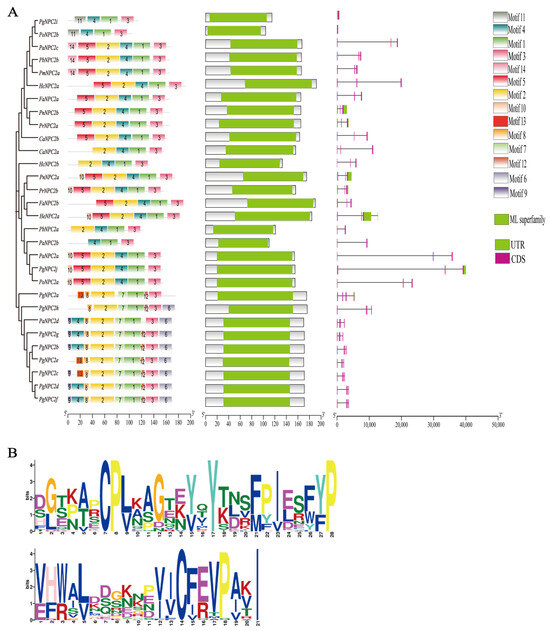Structural characteristics of NPC2 genes based on their phylogeny. (A) Left, schematic representation of conserved motifs of 30 NPC2 proteins with different colored rectangles representing conserved motifs 1–14. (A) Middle, conserved domains, with green boxes representing MD-2-related lipid-recognition (ML) domain and gray boxes not containing domains. (A) Right, structure of exons (pink boxes) and introns (black lines) of NPC2 genes, with green rectangles representing 3′ or 5′ end non-coding regions. (B) Conserved motifs: motif 1 and motif 3.