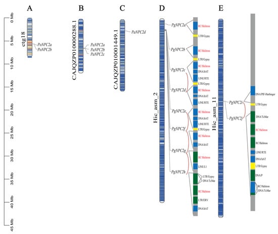 Chromosomal locations of the P. orleans, P. apollo, and P. glacialis NPC2 genes. (A) P. orlens chromosomal contig18. (B,C) P. apollo chromosomal contigCAJQZP010000288.1 and contigCAJQZP010001449.1. (D,E) P. glacialis chromosomes Hic-asm-2 and Hic-asm-11. Tandem duplicated gene pairs of P. glacialis are shown in the red arc. The green boxes represent complete transposons, the blue boxes represent partial transposons, and the yellow boxes represent LTR/Gypsy transposons.