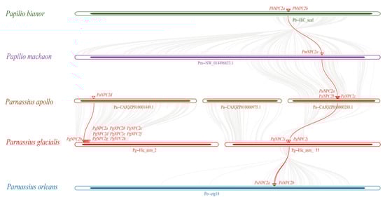 A plot of interspecific collinearity among P. glacialis, Pa. bianor, Pa. machaon, P. apollo, P. glacialis, and P. orleans. The gene pairs are highlighted by the red lines, with duplicated genes shown nearby. The gray lines indicate collinear blocks between chromosomes or scaffolds of different species.