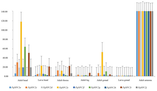 All ten PgNPC2 genes in the P. glacialis genome were used for qRT-PCR verification, and the results indicate that all PgNPC2 genes were expressed at relatively low levels in the thoraxes, legs, and gonads of the adults, as well as in the heads and gonads of the larvae; however, nine of the ten PgNPC2 genes were highly expressed in the antennae and moderately expressed in the heads of the adults. These facts indicate that the adult P. glacialis antennae and heads were likely to play a key role in the local adaptation of olfactory communication, host plant recognition, and reproduction through high-level PgNPC2 expression (Figure 7 and Table S4).