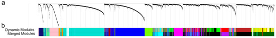WGCNA-constructed gene coexpression tree and generated modules: (a) Gene coexpression tree created using the TOM-based distances through average linkage. Each leaf corresponds to a different gene. (b) Original 42 modules produced by dynamicTreeCut (top row) and 28 modules produced after the merging of the original modules (bottom row). Each module is depicted with a different color.