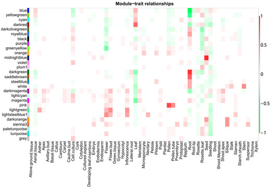 The PCCs between the eigengenes describing each of the 28 merged modules and the 55 tissue traits were calculated (Figure 2), allowing for the overall expression pattern of the genes of each module to be associated with specific healthy tissues/plant parts.