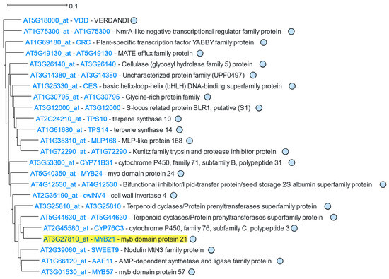 MYB21 was used as input for ACT2.6, and the produced coexpression clade was set to 13 internal nodes, containing 24 genes (Figure 3). All genes of this clade belong to the lightsteelblue1 module, including the two hub genes of this module (MYB21 and AT5G44630), which are located close to each other. GO enrichment analysis revealed enriched terms related to terpene biosynthesis, in accordance with the enriched terms of lightsteelblue1 module (Table 2), as 24 out of the 27 genes of this module are part of this clade.