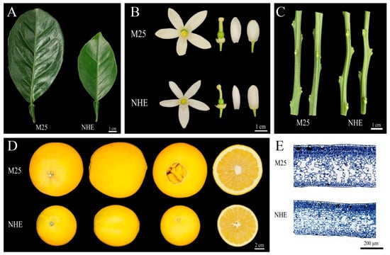 Performance of mutant M25 and Newhall navel orange. (A–D) were mature leaves (A), flowers (B), stems (C), and fruits (D) of M25 and Newhall navel orange, respectively. (E) Transverse sections of the leaf blade of the mature leaves in M25 and Newhall navel orange. The magnification of the microscope used to observe the samples was 100 times.