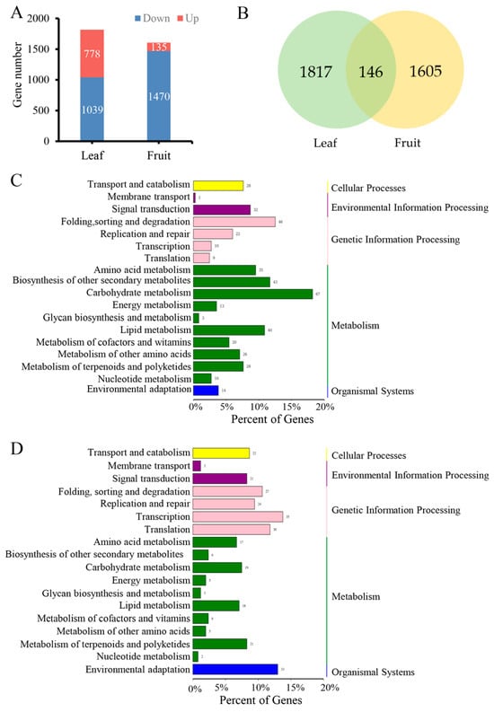 Identification and pathway enrichment analysis of DEGs related to organ size. (A) Number of DEGs; (B) Venn diagram analysis showing the number of common and unique DEGs identified in tender leaves and young fruits; (C,D) KEGG enrichment pathway (level 1 and 2) annotated classification results of all differentially expressed genes in M25 and Newhall navel orange in tender leaves (C) young fruits (D), respectively.