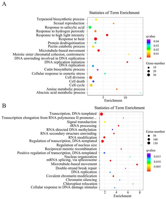 Next, GO enrichment analysis was conducted to classify the functions of all DEGs into three groups: biological processes, cellular components, and molecular functions (Supplementary Figure S5A,B; Supplementary Tables S8 and S9). Among the DEGs in both tissue types, cellular processes exhibited the greatest enrichment in biological functions (Supplementary Figure S5A,B). We further identified the 20 GO biological process terms showing the greatest enrichment in both tissue types (Figure 4A,B). DEGs in tender leaves were strongly enriched in cell division regulation processes, including cell division (q = 1.968 × 10−3), cell cycle (q = 1.004 × 10−2), DNA unwinding during replication (q = 4.250 × 10−5), and DNA replication initiation (q = 7.218 × 10−5) (Figure 4A). DEGs in young fruits were also significantly enriched in cell-division regulation processes, such as DNA replication (q = 1.3358 × 10−2) (Figure 4B), and in transcription regulation activity (Supplementary Figure S5A,B). Among biological processes, DEGs in young fruits were strongly enriched in protein biosynthesis regulation processes (Figure 4B). These findings indicate that the DEGs involved in cell division and protein biosynthesis were required for the basic cellular processes responsible for leaf and fruit size in navel orange plants.