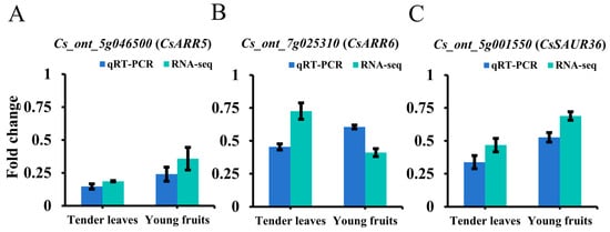 Expression analysis of 3 hormone-related genes in tender leaves and young fruits. Comparison of fold change in differential expression values determined by RNA-Seq (light blue) and qPCR (dark blue) for DEGs. (A) Cs_ont_5g046500; (B) Cs_ont_7g025310; (C) Cs_ont_5g001550.