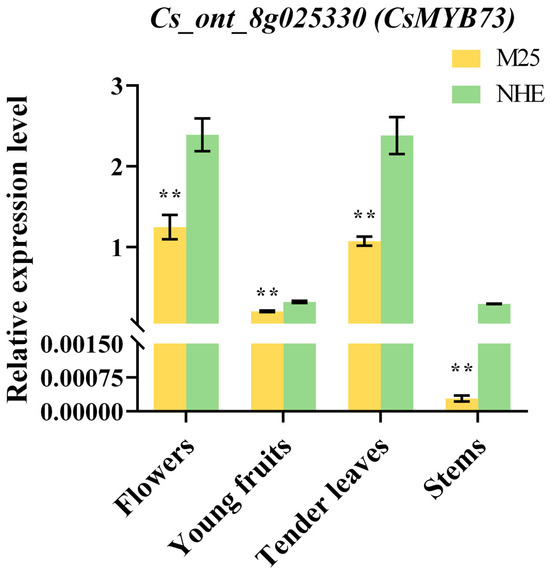 The relative expression levels of Cs_ont_8g025330. The error bars represent the standard error of three biological replicates. The significance analysis was performed by Student’s t-test; ** denotes significant at the 0.01 probability levels.