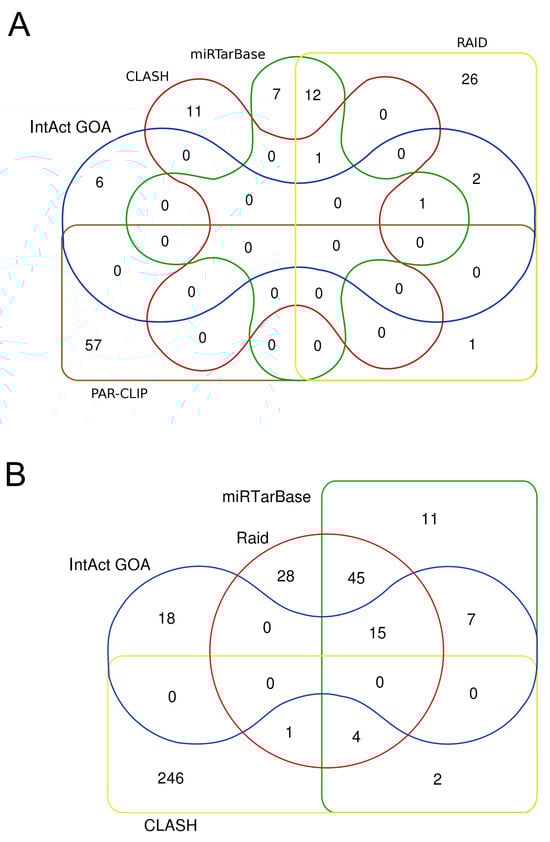 MicroRNA targets according to different datasets. (A) Human microRNA-132-3p targets (B) and microRNA-17-5p targets. The figure shows the limited overlapping among different resources or technical approaches. IntAct/EBI-GOA targets were manually curated from the literature and filtered for “luciferase assay” ([44,47]), the miRTarBase dataset was filtered for “luciferase assay” and RNAinter (Raid) for “strong evidence” [48,55], CLASH interactions were downloaded from IntAct [65], and PAR-CLIP was downloaded from miRTarBase.