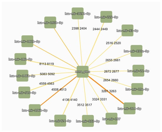 MicroRNA-PTEN regulatory network. MicroRNAs interacting with PTEN were downloaded from IntAct (accessed 20 January 2025). Binging regions inferred from mutation analyses are reported on the edges, if available (boundaries refer to ENST00000371953 transcript).