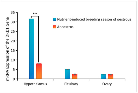 The hypothalamic–pituitary–ovarian tissue expression profile of the DRD gene in sheep tissues was studied. The DRD1 mRNA expression in the hypothalamus was significantly greater than that in the pituitary and ovary (p < 0.05). Moreover, there was no significant difference in the relative DRD1 expression between the pituitary and ovary (p > 0.05). Taken together, these findings indicate that the DRD1 gene is highly expressed in the hypothalamus (Figure 1).