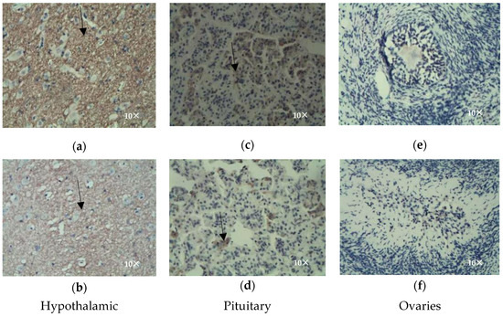 Hypothalamic (a,b), pituitary (c,d), and ovarian (e,f) immunohistochemistry.