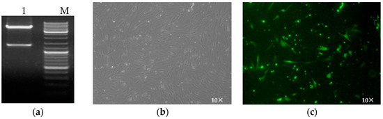 Construction and validation of recombinant plasmids. (a) Double enzyme digestion of pEGFP-C2-DRD1. 1: results of double enzyme digestion for pEGFP-C1-DRD1; M: the DNA marker DL10000. (b) Inverted microscope image after pEGFP-C2-DRD1 transfection. (c) Inverted microscope image after pEGFP-C2-DRD1 transfection.