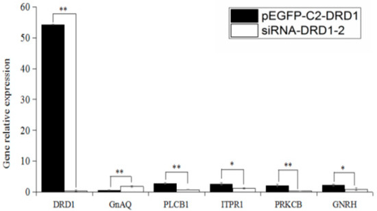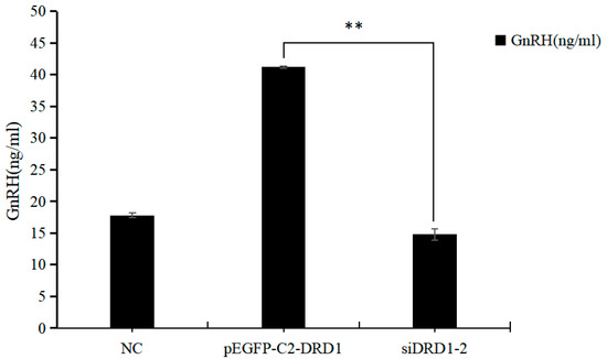 An enzyme-linked immunosorbent assay (ELISA) was used to assess the secretion of GnRH in the hypothalamic neurons of the DRD1-overexpressing group and siDRD1-2 group after transfection. The results showed that the secretion of GnRH in the pEGFP-C2-DRD1-transfected group was significantly greater than that in the siDRD1-transfected group and blank group (p < 0.05), indicating that DRD1 can affect the secretion of GnRH (Figure 8).