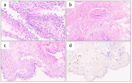 Interstitial cystitis (IC) was diagnosed according to the National Institutes of Health (NIH) criteria, which focus on the presence of irritative voiding symptoms without other identifiable pathology []. The European Society for the Study of Bladder Pain Syndrome (ESSIC) recommends cystoscopic investigation to identify increased mast cells in the detrusor muscle for diagnosing bladder pain syndrome/interstitial cystitis (BPS/IC) []. A cystoscopic examination was performed under anesthesia, and a bladder biopsy sample was taken using closed cup forceps through a flexible or rigid cystoscope after hydrodistension. The severity of the cystoscopic findings correlated with histological evidence of inflammation in the patient with IC and suspected pudendal nerve neuropathy was not analytically confirmed. Bladder tissues were fixed in 10% neutral buffered formalin and embedded in paraffin. For hematoxylin-eosin staining and immunohistochemical study, the embedded bladder tissues were sectioned into 4 µm thick slices, deparaffinized, treated with 0.3% hydrogen peroxide, and incubated as previously described []. CD117 immunohistochemistry was used to evaluate the predominance of mast cells in the inflammatory infiltrate in the lamina propria. The role and properties of these cells in the muscularis mucosae and in the detrusor are still being discussed and remain controversial.