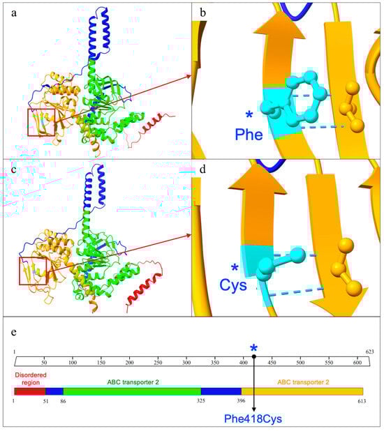 ABCF2 protein structure and domain organization. (a) Graphical representation based on the Alphafold prediction of the wild-type ABCF2 protein structure. (b) Focus on the wild-type Phenylalanine residue at position 418. (c) ABCF2 protein with the mutation Phe418Cys. The different mutated structure in comparison to the wild-type is evident. (d) Focus on the mutated Cysteine residue at position 418. (e) Functional domains and region organization. The image clearly depicts the mutation site (labelled with the blue asterisk), which is within the ABC transported domain.