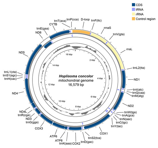 Circular map of the assembled H. concolor mitogenome, consisting of 13 PCGs, 22 tRNA, and 2 rRNA genes. Genes encoded on the reverse strand are illustrated inside the circle, while those on the forward strand are depicted outside the circles.