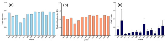 (a) K2P distance values, (b) nucleotide diversity (Pi) values, and (c) Ka/Ks ratio values for the 13 PCGs across 21 species of the Corydoradinae subfamily.