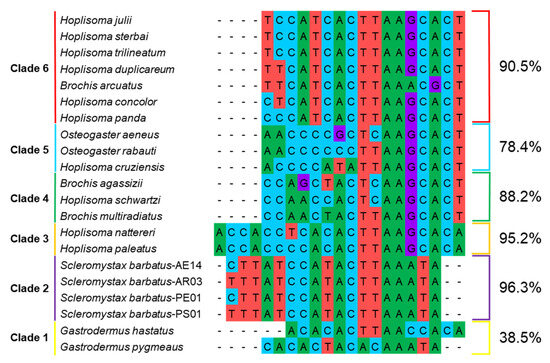 Clade 1, consisting of G. hastatus + G. pygmaeus, had an atp6-cox3 intergenic region characterized by (A)CACACTWMACMAMW(A) (Figure 6). Clade 2, represented by S. barbatus, contained the sequence YTTATCCATACTTAAATA. Clade 3, consisting of H. nattereri and H. paleatus, had an atp6-cox3 intergenic sequence of ACCACCYCACACTTAAGCACA. Clades 4 and 5 included [(Brochis agassizii + H. schwartzi) + B. multiradiatus] and [(Osteogaster aeneus + O. rabauti) + H. cruziensis], respectively, which exhibited the sequences CCARCYACTYAAGCACT and AMCCCMBMTYAAGCACT. Lastly, clade 6, comprising [(((H. sterbai + H. trilineatum) + H. duplicareum) + H. panda) + (H. concolor + B. arcuatus)], was characterized by the intergenic region YYCATCACTTAARCRCT. In the comparison of atp6-cox3 intergenic sequences between clades based on uncorrected pairwise distance, the highest identity percentage was found in the same clade, except for clade 1 (Figure S6 and Table S4). In addition, identity percentages were generally higher within clades than between clades.