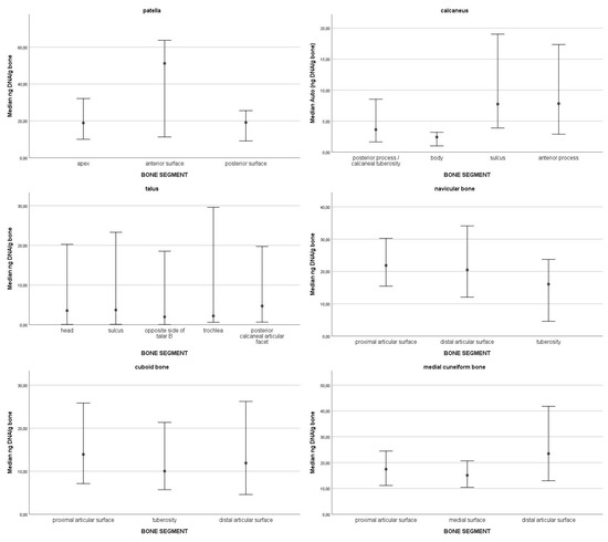 Firstly, the DNA quantity and degradation were analysed. On average, the highest mean amount of DNA was extracted from the patella (M = 30.01; SD = 23.97), followed by the navicular bone (M = 24.42; SD = 23.68), the medial cuneiform bone (M = 22.79; SD = 19.79), the cuboid bone (M = 20.25; SD = 23.6), the talus (M = 13.61; SD = 20.1) and the calcaneus (M = 9.51; SD = 13.61). The highest extracted DNA was from the distal articular surface of navicular bone 16 (106.99 ng DNA/g bone).