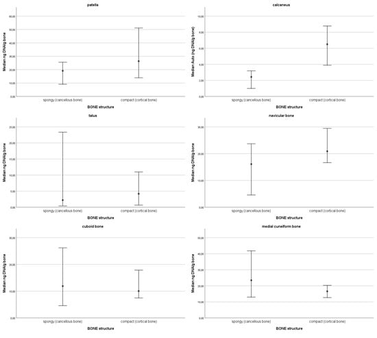 In the top 10% of values of DNA quantity, most samples were from the navicular bone (13), followed by the patella (11), cuboid bone (10), medial cuneiform bone (7), talus (4), and lastly, calcaneus (1). The top 10% values ranged from 106.99 ng DNA/g bone to 50.43 ng DNA/g bone. The 95% confidence intervals of medians for DNA quantity for each skeletal element are presented in Figure 1. Statistically significant differences were observed only in one skeletal element, the calcaneus; there is significantly more DNA in the sulcus compared to the other parts of the bone. On average, the highest degradation index was observed in the talus (M = 22.99; SD = 16.6) and in the calcaneus (M = 22.37; SD = 21.11), followed by the cuboid bone (M = 13.24; SD = 12.34), the medial cuneiform bone (M = 11.91; SD = 9.01), the navicular bone (M = 10.92; SD = 7.55) and the patella (M = 10.12; SD = 6.43). The 95% confidence intervals of medians for the degradation index by skeletal element are presented in Figure 2. All 95% confidence intervals were overlapping. Therefore, no statistically significant differences in the degradation index were observed. DNA quantity and degradation index were also analysed by either cancellous or compact bone type. The 95% confidence intervals of medians for DNA quantity (Figure 3) and the degradation index (Figure 4) for each skeletal element are presented in their respective Figures. All observed 95% confidence intervals overlapped, showing no statistically significant differences. In most ENC samples, no Power Quant targets were detected. In cases where an amplification product was observed, the amount of DNA did not exceed the detection limit for the Power Quant kit, indicating no contamination (data available in Supplementary Material, File S2).
