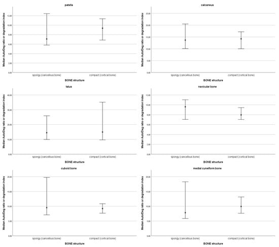95% confidence intervals of medians for the degradation index by skeletal element.