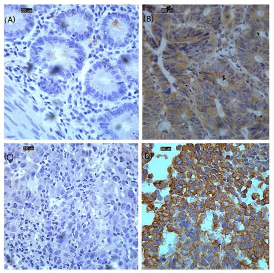 The FFPE samples were stained with an optimized FXR2 antibody using an IHC protocol. The tissue sections were prepared, dewaxed, rehydrated, and treated with hydrogen peroxide (H2O2, Fisher Scientific, H/1750, Loughborough, The United Kingdom (UK)) to block endogenous peroxidase. The manufacturer’s instructions were followed for antibody retrieval, and antigen retrieval was performed using citrate buffer at pH 6. Sections were blocked in a blocking solution containing 2% (w/v) bovine serum albumin (Sigma-A4042, St. Louis, MO, USA) to prevent non-specific binding and then incubated with a 1:10 diluted FXR2 rabbit polyclonal primary antibody (Sigma, HPA018246, St. Louis, MO, USA) at room temperature for 1 h. After washing, sections were incubated in a 1:200 dilution of a biotinylated anti-mouse secondary antibody (Vector Laboratories, PK-6102, Newark, NJ, USA) and avidin–biotin complex (ABC, Vector Labs, PK-6100, Newark, NJ, USA). Diaminobenzidine was subsequently applied to the sections (Vector Laboratories, SK-4100, Newark, NJ, USA). Slides were counterstained with Mayer’s hematoxylin (Sigma, MHS16, St. Louis, MO, USA), dehydrated, and mounted. Negative and positive controls were incorporated in IHC. As a negative control, the primary antibody was omitted from the tissue. A tissue section from colon cancer was stained as a positive control, as recommended by the antibody manufacturer (Figure 1A,B).