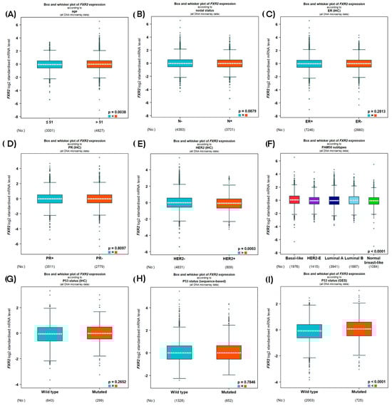 BC Gene-Expression Miner v5.0, a statistical mining tool for published annotated BC transcriptome data, comprising DNA microarrays (n = 10,872) and RNA sequences (n = 4421), was used to assess the expression of FXR2 mRNA []. An assessment of FXR2 mRNA expression and its correlation with a variety of aggressive features of BC, such as molecular subtype, tumor grade, and tumor size, was performed.