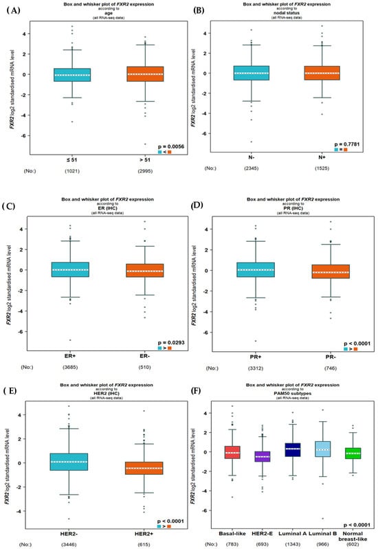 FXR2 mRNA expression in relation to breast cancer clinical features based on RNA sequence data. Correlation of FXR2 mRNA with (A) age, (B) nodal status, (C) ER (IHC), (D) PR (IHC), (E) HER2 (IHC), and (F) PAM50 molecular subtypes (more significant in luminal B and basal-like subgroups).