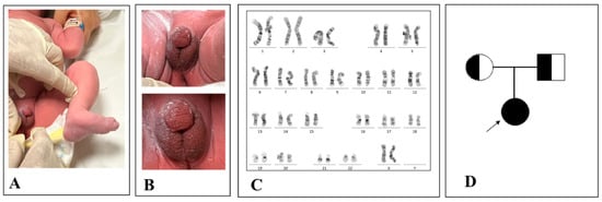 Patient’s ambiguous genitalia: congenital clubfoot (A) and hypospadic penis and empty scrotum (B) as per a virilized female. Patient’s genotype with a 46, XX genotype (C). Patient’s family tree (D).