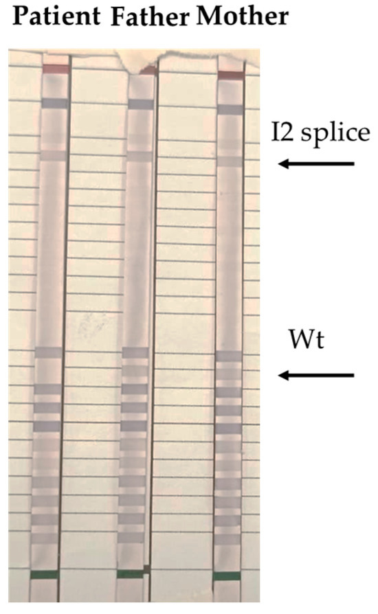 Then, to confirm clinical suspicion of the CAH disease, we performed a reverse dot blot (Figure 2) and Multiplex Ligation-dependent Probe Amplification (MLPA) (Figure 3) on CYP21A2 gene of the patient and parental DNA. Therefore, we identified c.290-13A/C>G (I2 splice) mutation overlaps that results from the family tree analysis: homozygous for the patient and heterozygous for her parents. Specifically, for reverse dot blot, we used two panels for CYP21A2 gene polymorphisms: a panel for wild-type (wt) polymorphism and a panel with 11 highest frequency polymorphisms inducing disease. After the PCR test, DNA fragments were hybridized with oligonucleotides probes and we found c.290-13A/C>G (I2 splice) mutation in both the patient and her parents. The patient was homozygous for c.290-13A/C>G (I2 splice) mutation, revealed also by the lack of signal in the wt stripe. In contrast, wt stripes were found in both father and mother confirming they were heterozygous for c.290-13A/C>G (I2 splice) mutation in CYP21A2 gene.