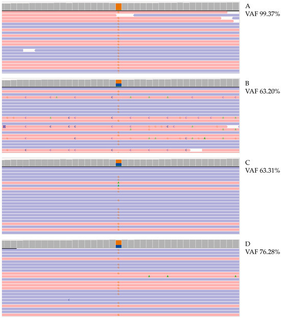 Molecular analysis of CYP21A2 gene. Photographs of Integrative Genomics View (IGV) representation of the c.290-13A/C>G (I2splice) mutation in CYP21A2 gene identified with NGS, VAF calculated on affected patient (A), patient’s father (B), patient’s mother (C), and cfDNA (D). VAF, variant allele frequency. Red and blue lines represent the aligned reads in paired-end. Orange squares represent the frequency of reads carrying alternate allele.