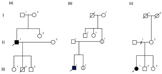 Family trees of the episodic ataxia patients: (a) Case 1 (II-1), (b) Case 2 (III-1), (c) Case 3 (III-1). Cases 1 and 3 had no obvious family history. The family of Case 2 included patients with ataxia (II-4) and absence seizure (III-2) with the same CACNA1A variant (p.W1835*).