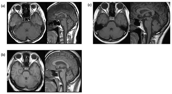 Brain MRI findings of the three patients. (a) Case 1, (b) Case 2, (c) Case 3. T1-weighted axial and sagittal images show mild upper cerebellar vermian atrophy.