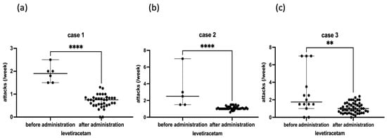 Number of episodic ataxia attacks before and after levetiracetam administration. The number of episodic ataxia attacks was significantly reduced after levetiracetam administration in Case 1 (a) and Case 2 (b), and slightly reduced in Case 3 (c). (Unpaired t-test: **** p < 0.0001, ** p < 0.01.)