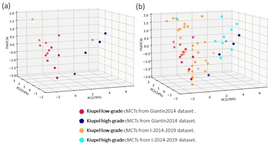 Principal Components Analysis of Expression Profiles from 12 Transcripts in cMCT Samples. (a) PCA of the Giantin2014 dataset, illustrating 13 low-grade (red dots) and 5 high-grade (blue dots) cMCTs, using the expression profile of the 12 target transcripts identified in [27] (listed in Table 1). (b) PCA of the Giantin2014 dataset and projection of 50 new cMCT samples from the I-2014–2019 dataset. Red and blue dots represent histologically classified low-grade and high-grade samples from the Giantin2014 dataset, respectively. Orange and cyan dots represent histologically classified low-grade and high-grade cMCT samples from the I-2014–2019 dataset, respectively. The transparency of each dot provides a visual cue for its relative position in the third dimension.