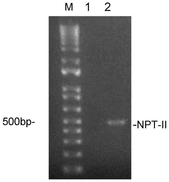 Analysis of the NPT-II gene in tobacco leaves. DNA was extracted from leaves, amplified by PCR with NPT-II.for and NPT-II.rev primers, and run on 1.5% agarose gel. Lanes 1 is a negative control, loaded with the amplification product from wt tobacco, while lane 2 is loaded with the amplification product of Npt-II tobacco. Lane M, 100 bp DNA ladder.