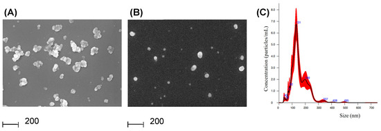 PDEVs were isolated as described in 2.1 and then prepared for SEM analysis as previously described [20]. Briefly, 100 K and 40 K fractions were fixed in glutaraldehyde to prepare for SEM. Vesicles were resuspended in approximately 30 µL of VIB (Buffer VIB filtered 0.22 µm), and proteins were quantified by the Bradford method (Quick Start Bradford assay, Bio-Rad). The 40 K fraction protein amount was too low to be quantified. A total of 2 µg of proteins of the 100 K EVs sample and an arbitrary volume of 40 K EVs (2/3 of the sample) were used. Vesicle samples were diluted in 2 mL of 2.5% glutaraldehyde (v/v) in Phosphate-Buffered Saline (PBS) 1X and fixed for 15 min. Then, they were washed in 15 mL of dd-water (0.22 µm filtered), placed in Vivaspin (Sartorius, Göttingen, Germany) tubes (cut off 300 KDa), and centrifuged at 3000× g for 3 min. The eluate was discarded and samples were washed again twice in 15 mL of water and centrifuged under the same conditions. Finally, concentrated EVs were recovered and moved to 1.5 mL tubes. Two dilutions were prepared (1:20 and 1:500 of the recovered vesicles), and 20 µL of each dilution was seeded onto 12 mm diameter glass coverslips. The slides were fixed on a metal support and metallized with a thin layer of conductive material for electron microscopy.