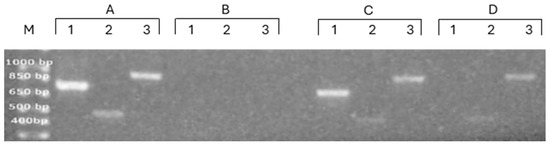 After confirming that the NPT-II transcript was co-isolated with EVs from the 100 K fraction, we investigated whether other genes, which are encoded by tobacco, were also co-isolated with EVs. We examined the presence of two additional amplicons: the first one, named the ITS (Internal Transcribed Spacer), about 768 bp length, is included in a region of the ribosomal RNA precursor, so it is a transcribed region that is not removed during rRNA maturation. The second amplicon, named rps, about 918 bp length, encodes for the mitochondria/chloroplast small subunit; it is transcribed using these organelles DNA as the template and is not part of nuclear genomic DNA. Therefore, many copies are present in the sample. Figure 3 shows that ITS, NPT-II, and rps amplicons could be obtained using as the template DNA from leaf but not DNA from PDEVs (Figure 3, lanes A and B, respectively). Similarly, all three amplicons could be detected when cDNA obtained from leaf RNA was used as the template (Figure 3, lanes C), and, interestingly, signals could also be detected using end-point PCR when cDNA obtained from PDEVs RNA was used as the template, very clearly for the rps amplicon, less intense but detectable for the NPT-II gene, and not clearly detectable for the ITS amplicon. These results indicated that mRNA encoded by the mitochondrial genome, which is present in high copy numbers, can be detected as associated with PDEVs of the 100 K fraction, protected from degradation, whereas ITS, which is an RNA destined for degradation as it is not a part of mature ribosomal RNA, could not be detected in these conditions.