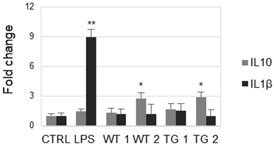 Previous studies have provided evidence that PDEVs exert immunomodulatory effects in vitro and in vivo [21]. Therefore, we determined whether PDEV isolated from the apoplastic fluid of both wild-type and transgenic tobacco modulated inflammation in the in vitro cell model. THP-1 cells, like primary monocytes and macrophages, express a variety of inflammation-related cytokine genes in response to different stimuli. The expression of IL-1β, a pro-inflammatory cytokine [22], and IL-10, which is considered an anti-inflammatory cytokine [23], was assessed in THP-1 cells following the administration of PDEVs isolated from the apoplastic fluid of both wild-type and transgenic tobacco. THP-1 was incubated with two different concentrations of PDEVs (approximately 0.8 µg and 2.4 µg/mL), and then the mRNA expression level of IL-1β and IL-10 was determined by qRT-PCR (Figure 4). The levels of cytokines induced by the endotoxin lipopolysaccharide (LPS), which has been shown to promote cytokine release in various cell culture models [24], were assessed as the positive control. Gene expression changes were compared to those of untreated cells and analyzed as control. The results showed that the levels of the pro-inflammatory cytokine IL-1β are not increased in PDEV-treated cells compared to LPS-treated cells, but only in the positive control represented by LPS-treated cells. On the other hand, the anti-inflammatory cytokine IL-10 is instead increased (p < 0.05) in cells treated with the highest concentration of PDEVs, either isolated from wild-type or transgenic tobacco.