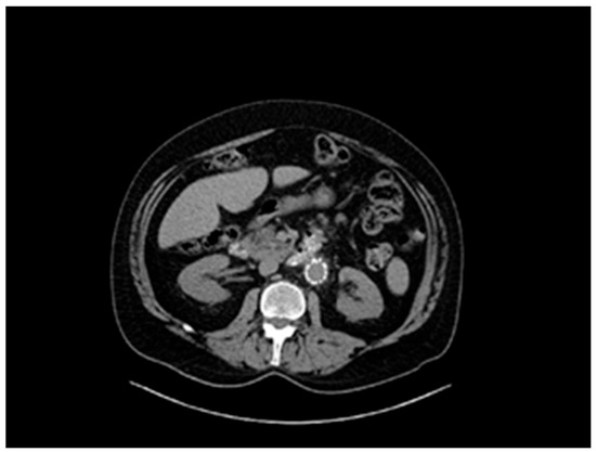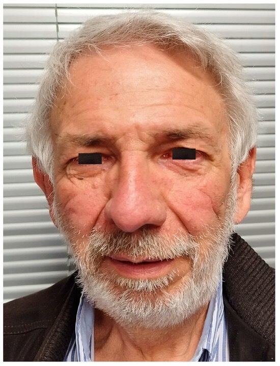 A 61-year-old patient with a history of probable Marfan syndrome was examined after referral from the treating physician because of hyperthyroidism. The tentative diagnosis of Marfan syndrome was set two decades ago based on the patient’s phenotype and a personal record of a Sinus of Valsalva aneurysm. The phenotype included a tall and lean statue, high-arched palate, crowded teeth, arachnodactyly, and divergent strabismus (Figure 1). The patient gave informed consent for the publication of his photo. The patient’s height was 188 cm, and his current weight was 88 kg. At the age of 49, a diagnosis of a 7 cm Sinus of Valsalva aneurysm was made (Figure 2), accompanied by concurrent grade 3 to 4 aortic valve insufficiency. The aortic aneurysm’s Z-score was 7.6, considering the patient’s sex, age, height, and weight. Previous surgical intervention involved an aortic valve replacement. Six years later, at the age of 55, the patient was hospitalized for an infrarenal abdominal aorta aneurysm measuring 4.9 cm, which was managed with endovascular repair and stent placement (Figure 3). Other medical history included an ischemic stroke in the right middle cerebral artery at age 56, attributed to insufficient anticoagulation in the context of a prosthetic aortic valve. The stroke did not result in any lasting neurological deficits. The patient did not present with cerebral aneurysms and had no history of arterial hypertension, hypercholesterolemia, diabetes mellitus, or active smoking.